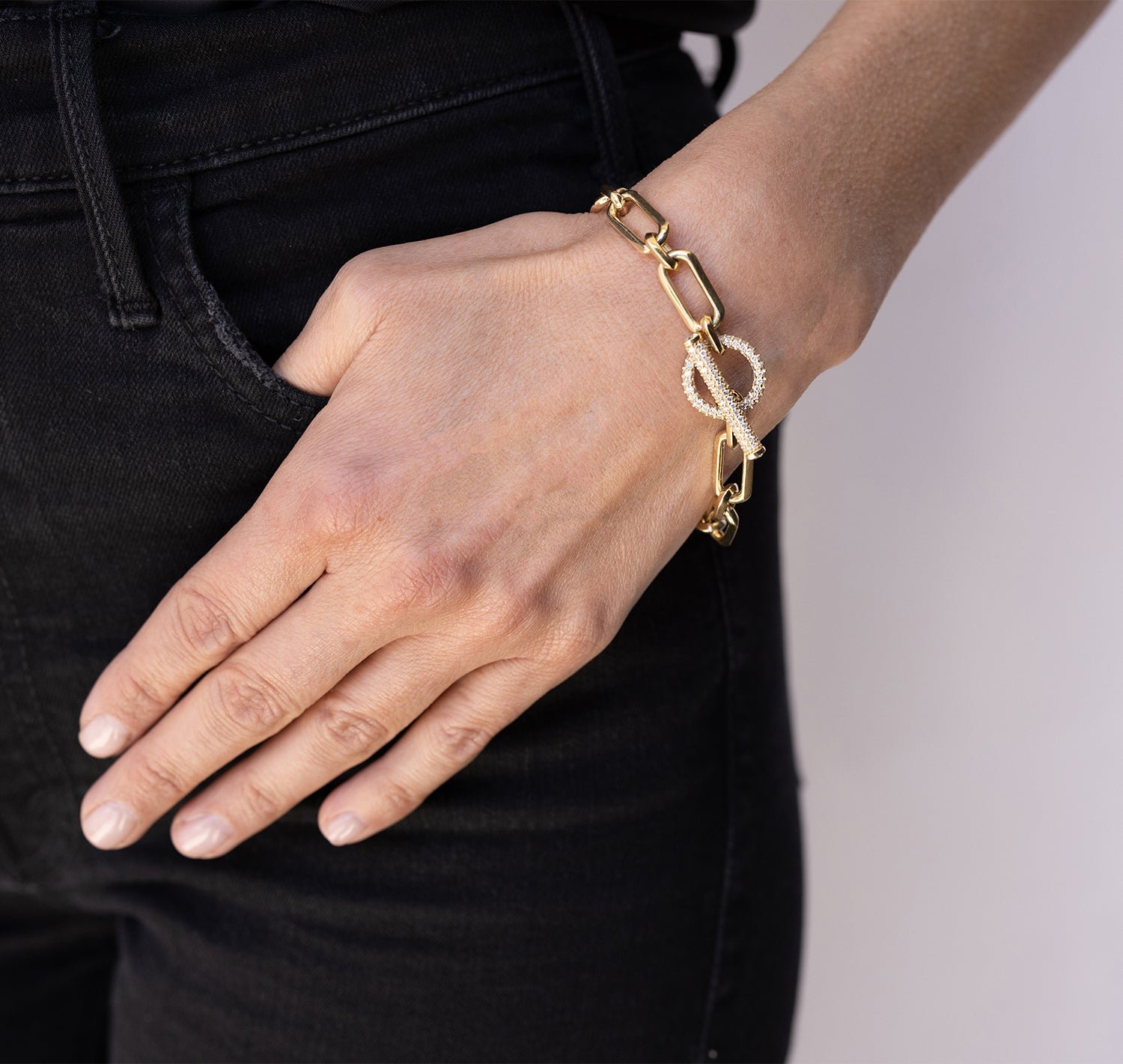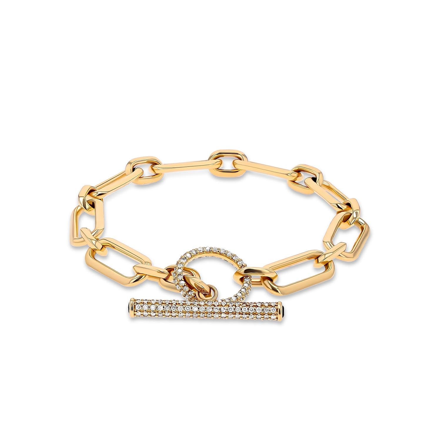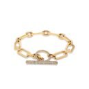 • 14k gold. pave diamond toggle closure with sapphire accents on each end of the toggle