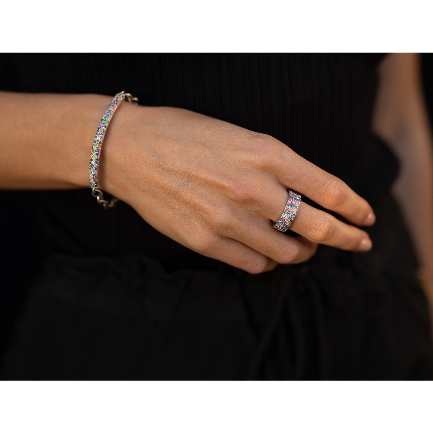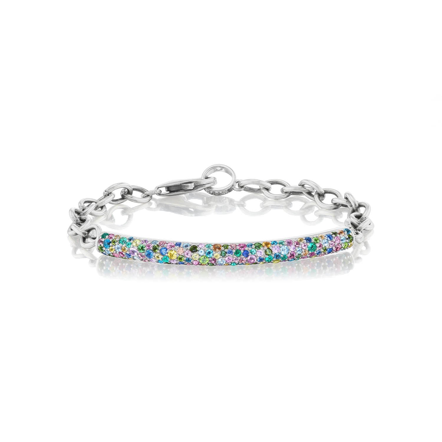 - Rainbow gemstones (light pink sapphire. light blue sapphire. yellow sapphire. orange peach sapphire. dark pink tourmaline. pink tourmaline. London blue tourmaline. mint tourmaline. emerald. aquamarine)
